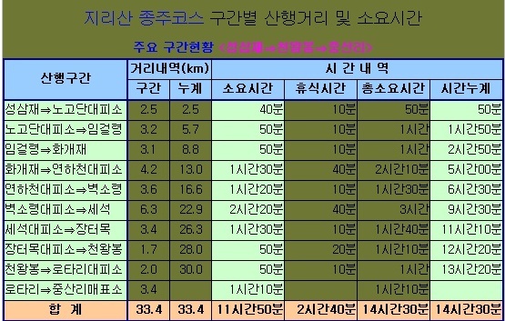 ○ 등산코스 : 성삼재휴게소-노고단고개-돼지령-임걸령-노루목-삼도봉(1506m)-화개재-토끼봉(1530m)-명선봉(1583m)-연하천대피소-형제봉(1430m)-벽소령대피소-덕평봉(1522m)-선비샘-칠선봉(1570m)-영신봉(1689m)-촛대봉(1698m)-삼신봉(1660m)-연하봉(1710m)-장터목대피소-제석봉(1800m)-통천문-천왕봉(1915m)-통천문-제석봉(1800m)-장터목대피소-천왕봉(1915m)-중산리